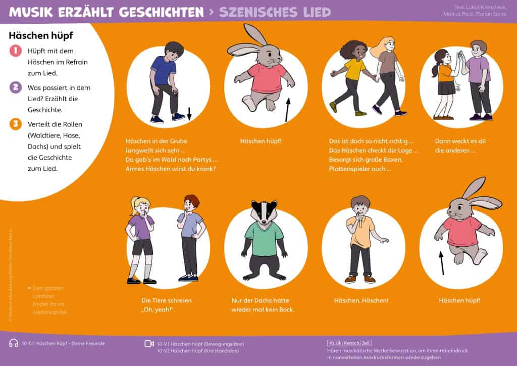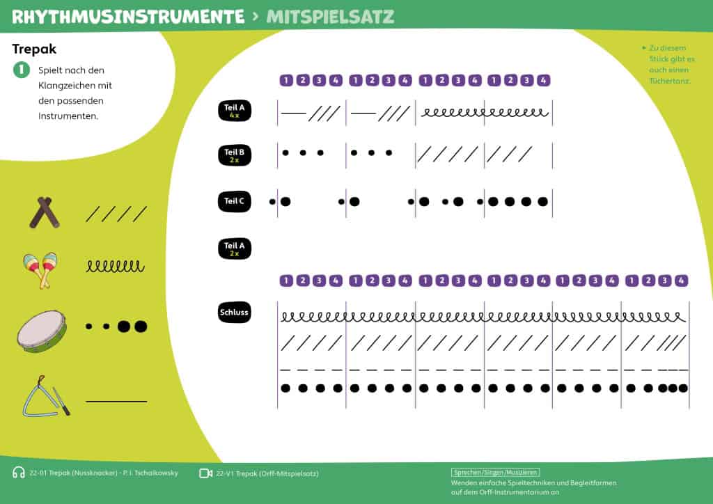 Kombination aus Liedern, Bewegungsaufgaben, Hörbeispielen und Spielen. Inhalte können für unterschiedliche Lernniveaus angepasst werden. Mehr Möglichkeiten für aktive und kreative Musikstunden.