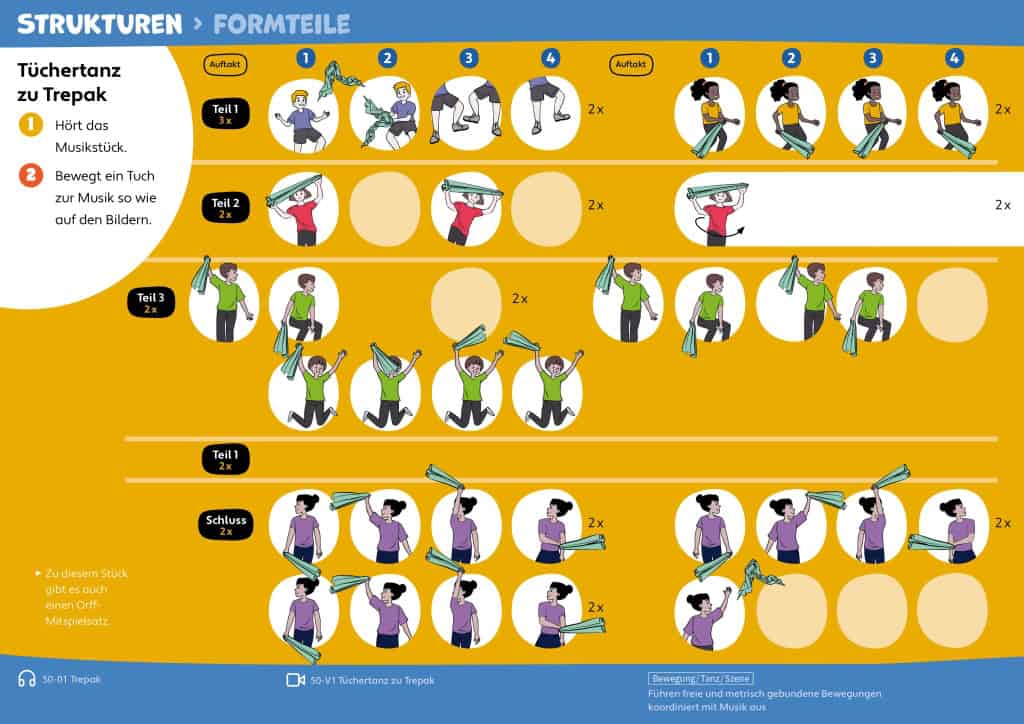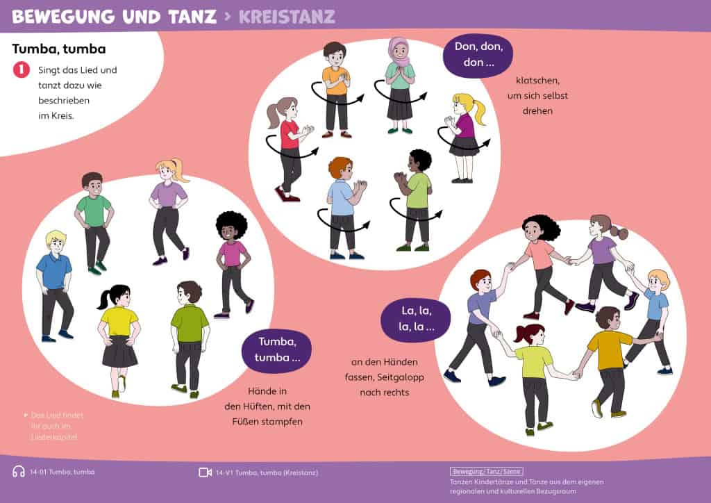 Das Schulbuch verbindet: Singen, Musizieren mit Instrumenten, Bewegung und Tanz, szenisches Spiel, Hören und Reflektieren.